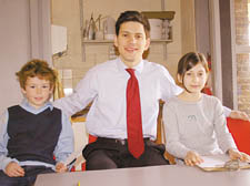 Pictured: David Miliband with pupils Owen Gearty, 10 and Paige Portal, 11. |