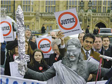 A GRIEVING widow has issued a writ for damages against the Peter Stringfellow organisation following the violent death of her husband at the hands of a bouncer.